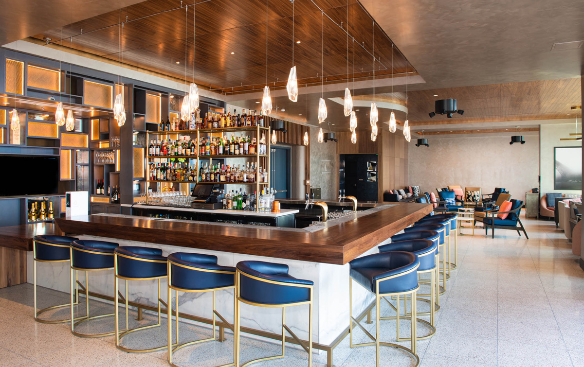 A modern bar with blue stools, wooden accents, and various bottles displayed. Pendant lights hang above, and seating is in the background.