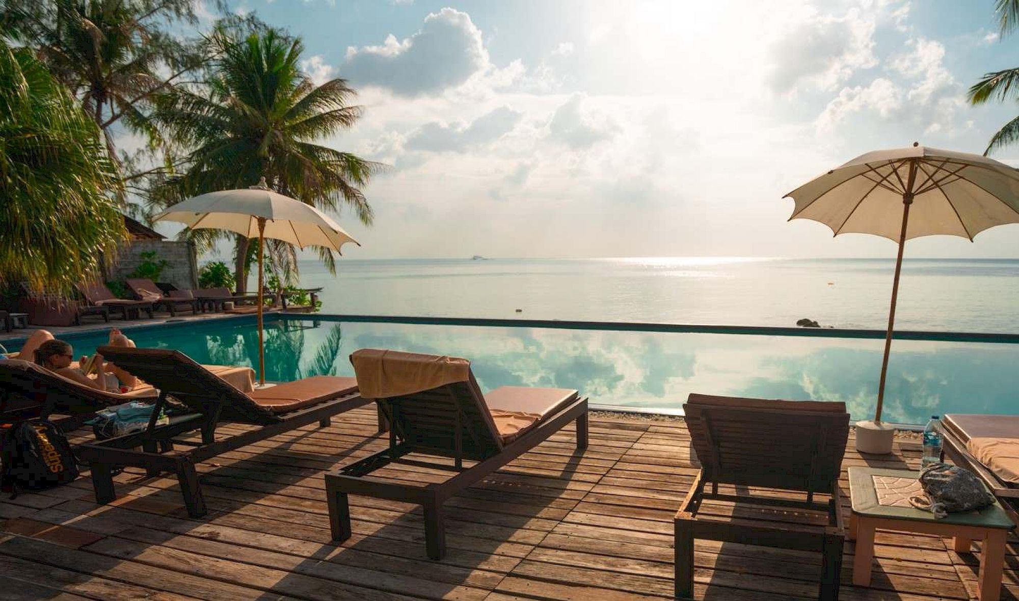 Lounge chairs and umbrellas overlook a calm infinity pool with palm trees and a bright sky in the background.