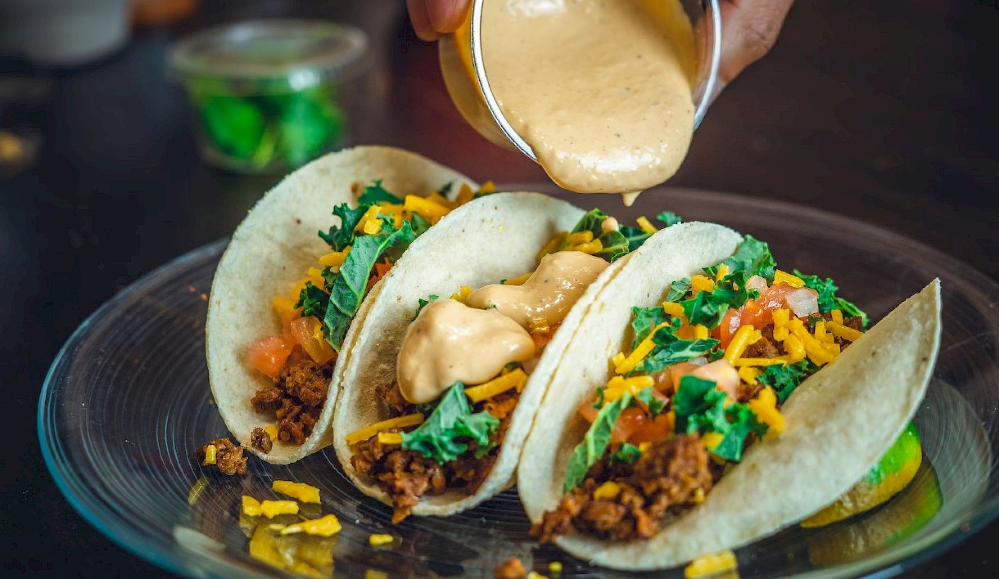 Three tacos with lettuce, tomatoes, cheese, and ground meat are being topped with creamy sauce.