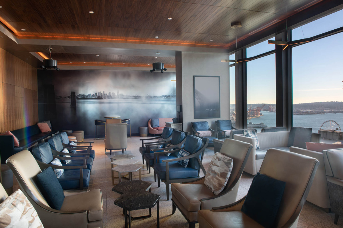 The image shows a modern cityscape view from a sleek, stylish rooftop terrace with seating, overlooking tall buildings at dusk.